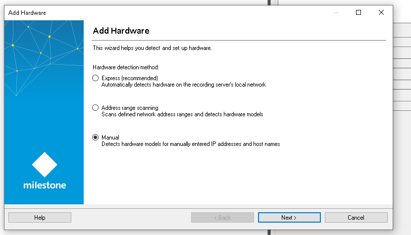 Step 1: Go to “Recording Servers” to “Add Hardware”, select the “Manual” option, and click “Next.”
