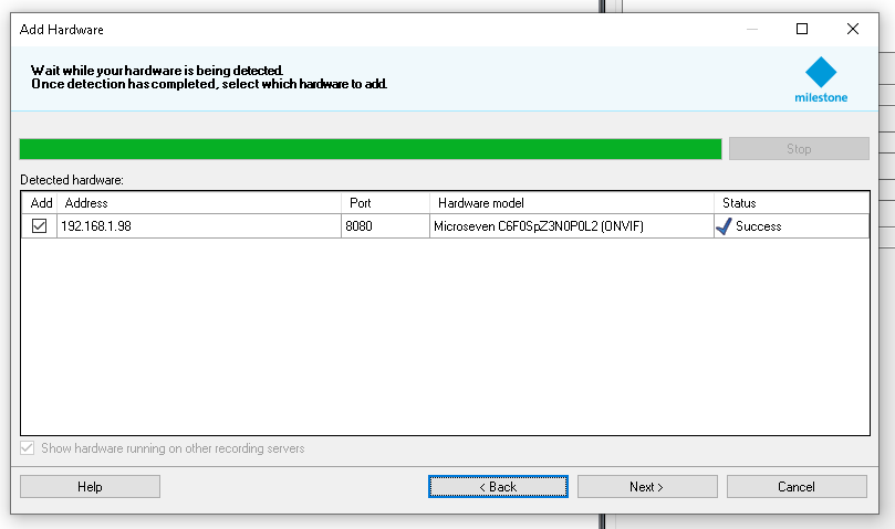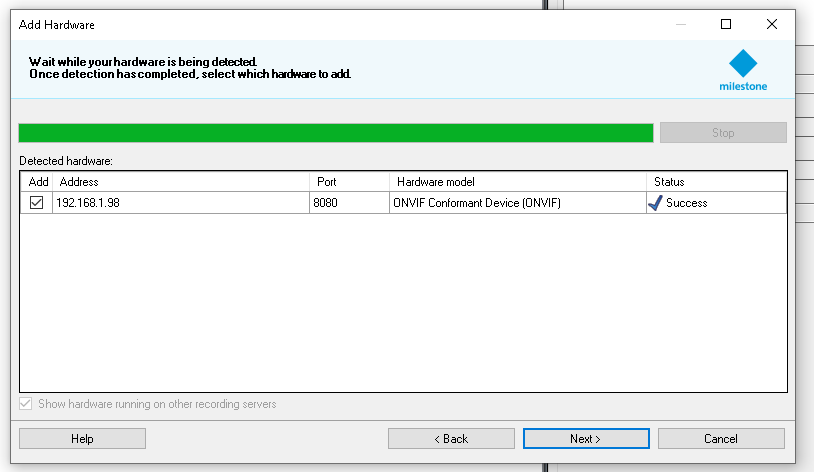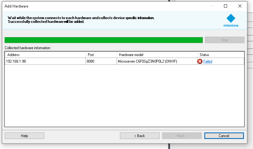 As you can see in the screenshots above, it shows that when Milestone identifies the camera on the network it is successful, but when Next is clicked and Milestone attempts to add the camera to the server it fails.