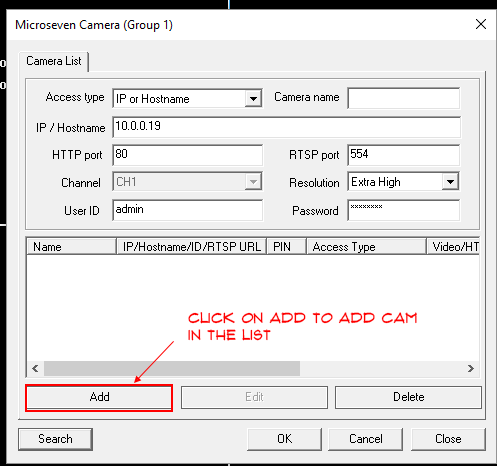 Step 5. An IP address is added by selected in the field “”IP/Hostname”. In Cam UserID, enter “admin” is a default, if you have changed it, you have to enter it using your own. In Password, enter “password” is a default, if you have changed it, you must enter your new password. Then click on “Add”