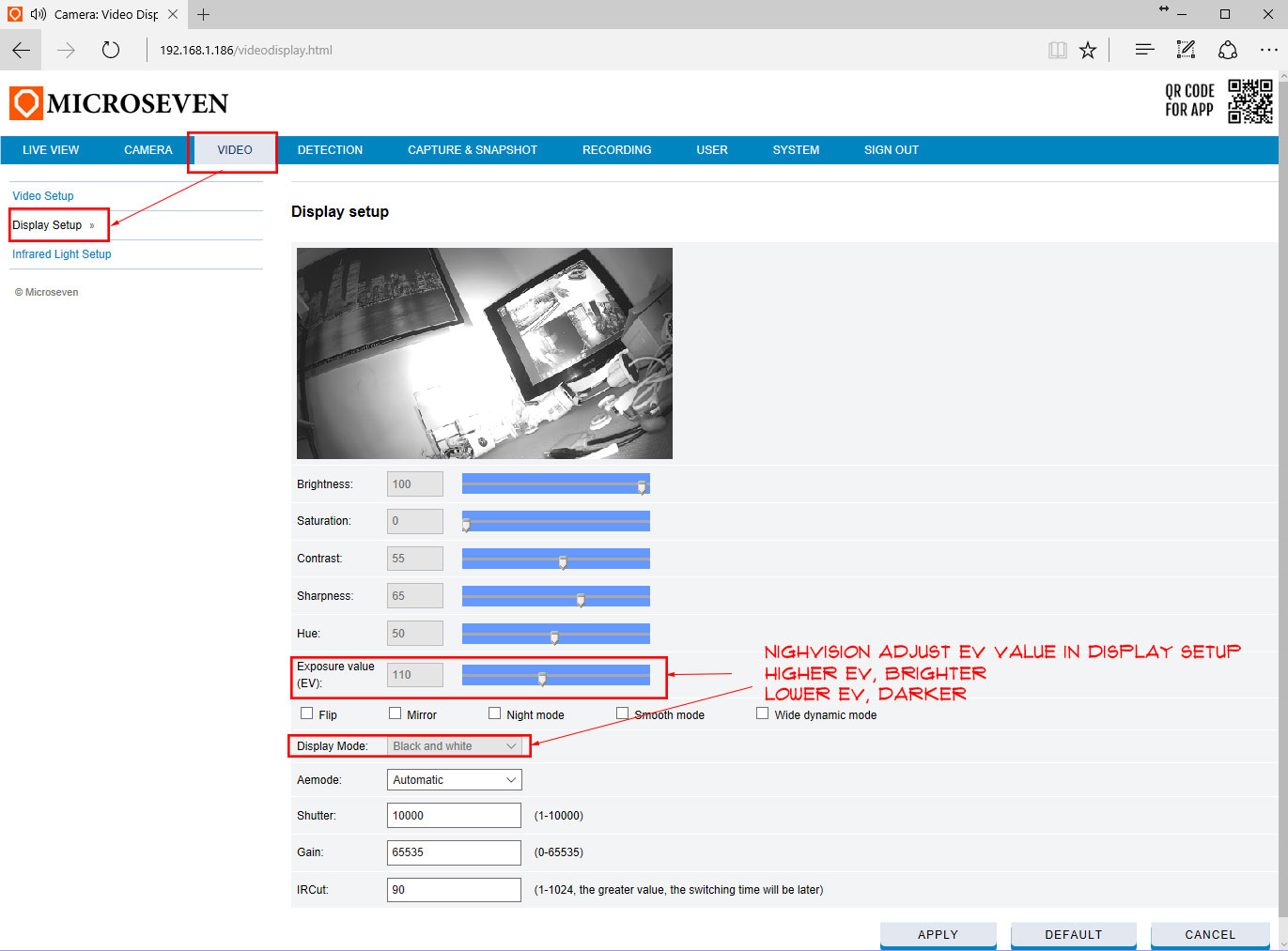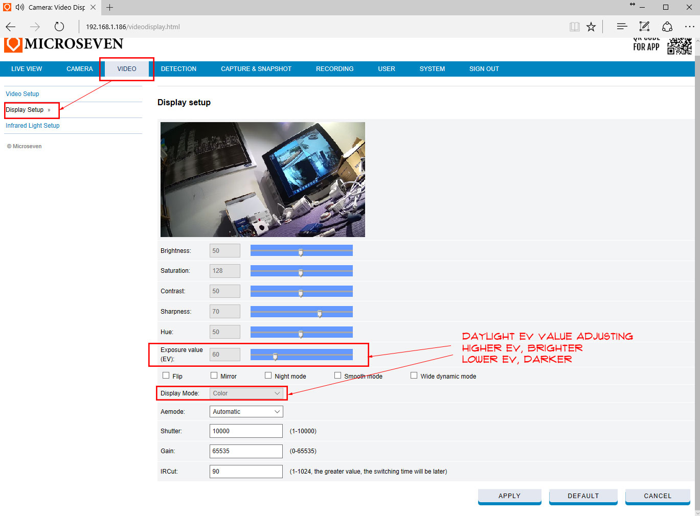 How To Adjust Brightness In Night Vision And Daylight Vision -EV January 17, 2020September 18, 2017 by microseven How To Adjust Brightness In Night Vision And Daylight Vision -EV Go to VIDEO -> Display Setup to adjust EV value: Night vision Adjusting: Daylight vision adjusting: