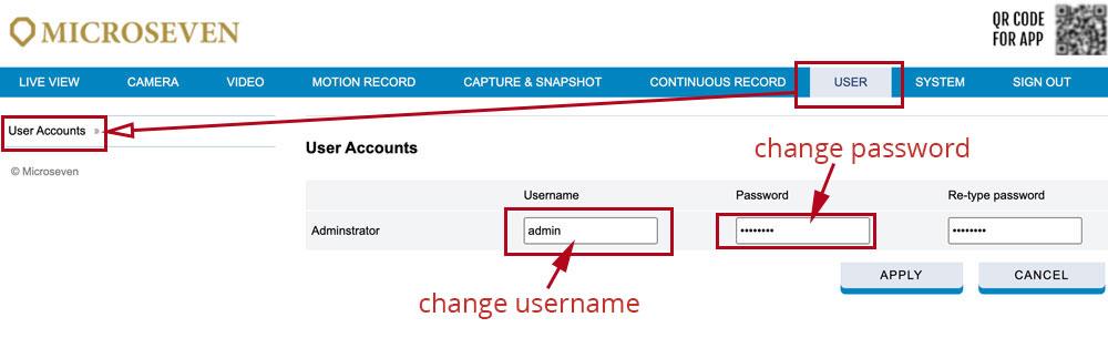 How To Change Password In A Camera (Credential) March 2, 2024August 10, 2017 by microseven Here is how to change username and password in a camera: Find the camera IP address and open it in the browser. Go to USER -> User Accounts to change the information and click APPLY to save the configuration.