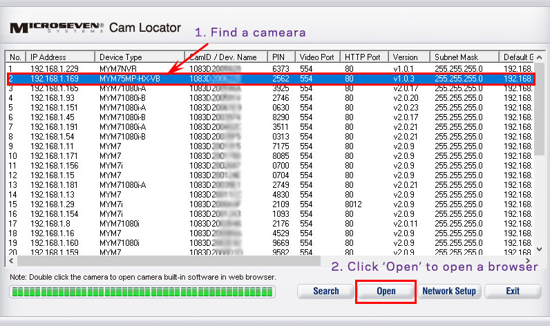 Step1. Find a camera in the Cam Locator, and click ‘Open’.