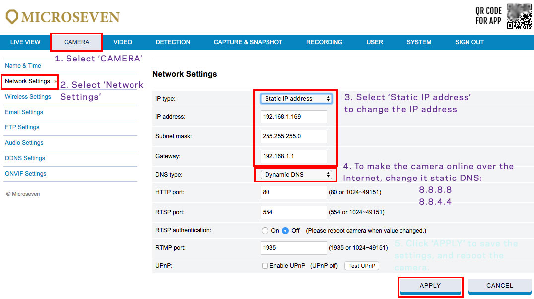 Step3. You can change the DHCP to a static IP address for the camera. The following screenshot shows how to do it. If you want to change the camera DNS, please set the DNS to 8.8.8.8 and 8.8.4.4. After you click the ‘APPLY’. You may need to find the camera IP address since it changes.