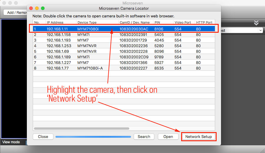 Step1 Open the Cam Locator screen, highlight the camera, then click on the ‘Network Setup’ button: