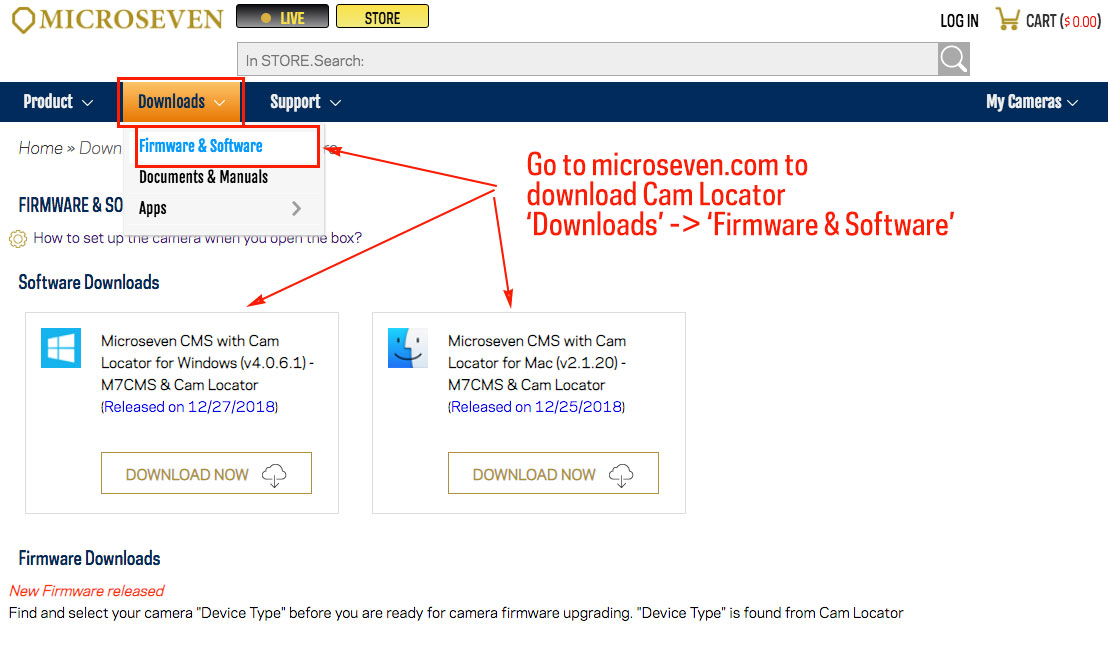 Step1: Download the Cam Locator software from microseven.com. Go to ‘Downloads’, select ‘Firmware & Software’ to download the software, choice your software version for Windows or macOS. You can go to the App or Google Play store to download the app. The Cam Locator is built in the app.